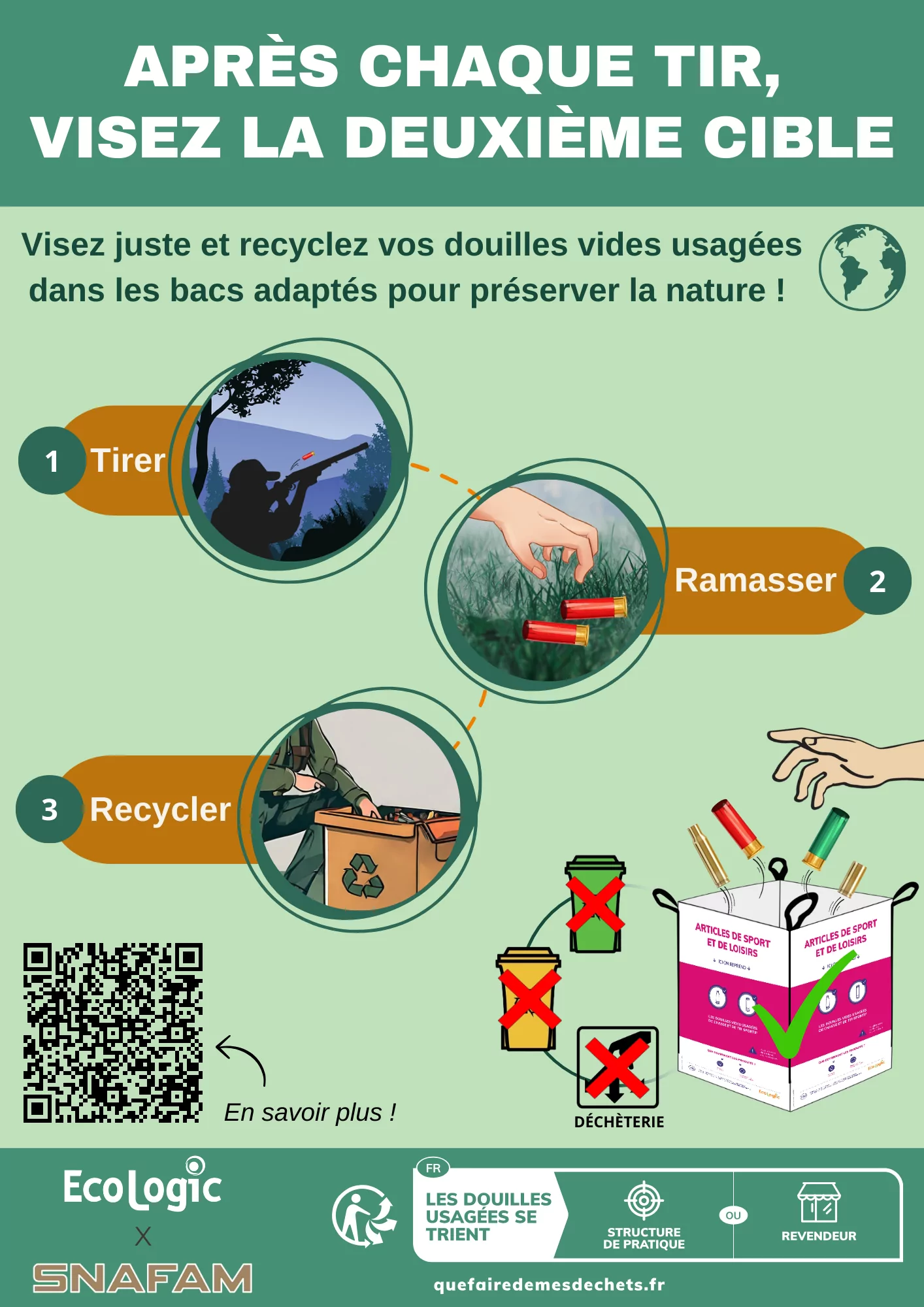 Afin de préserver notre environnement, nous vous demandons de ramasser soigneusement vos douilles usagées après chaque tir et de les déposer dans les bacs de tri mis à votre disposition à la Maison de la Chasse et de la Nature à Norges-la-Villes.