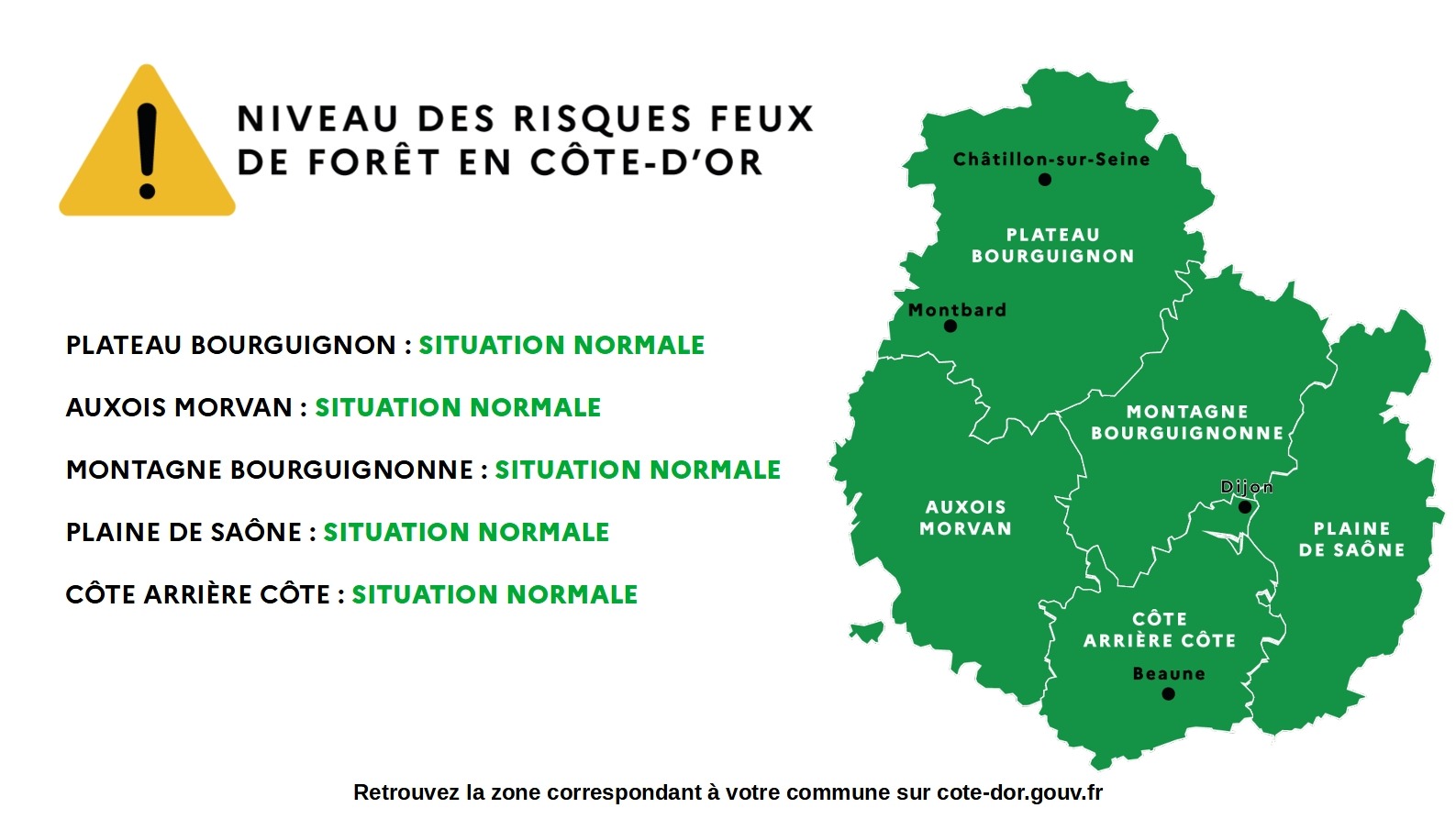 Compte tenu des conditions météorologiques et après avis du comité technique, le préfet de la Côte-d’Or a décidé de lever l’ensemble des mesures applicables jusqu’à présent dans les zones concernées par le risque feux de forêt. Il est important de rappeler que l’interdiction de fumer et faire un feu dans les zones boisées reste applicable sur l’ensemble du département.