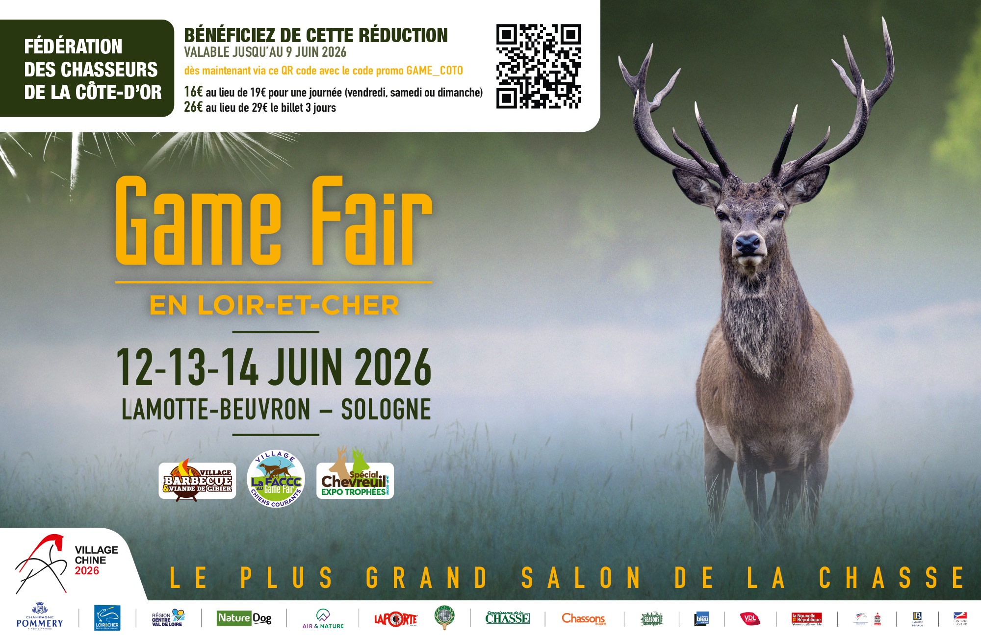 En partenariat avec la FDC21, bénéficiez d’un tarif préférentiel pour assister à l’édition 2026 du Game Fair, qui se tiendra du 12 au 14 juin. Grâce au code promo GAME_COTO, les billets sont proposés à 16 € au lieu de 19 € pour une journée, et à 26 € au lieu de 29 € pour un pass 3 jours. Cette offre est également accessible en scannant le QR code mis à disposition.