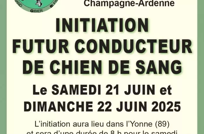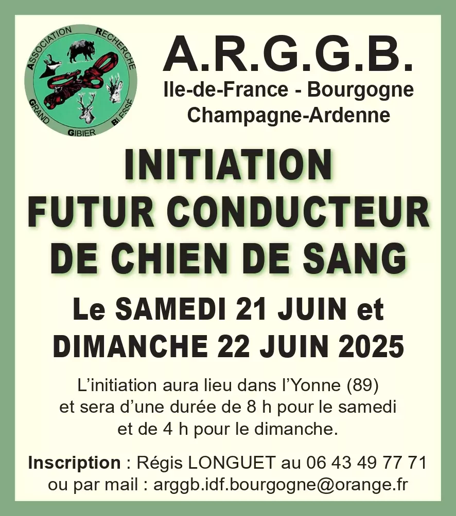 📅 Rendez-vous les 21 et 22 juin 2025 dans l’Yonne (89) pour une formation organisĂ©e par l’A.R.G.G.B. (Association Recherche Grand Gibier BlessĂ©), regroupant les rĂ©gions Île-de-France, Bourgogne et Champagne-Ardenne.